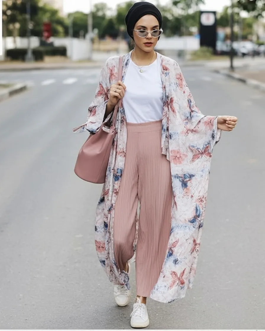 If your summer style leans polished but you still want movement and comfort, this is such a beautiful direction to go. The flowing outer layer, the soft pleated Pants, and the clean top underneath create a look that feels graceful and modern without being stiff. It has that polished Muslim casual chic mood that feels confident from the second you put it on. There’s softness here, but also intention, and that balance is what makes it such a strong aesthetic inspiration for modest dressing. For women who love outfits that feel elevated on a regular day, this one absolutely belongs on the inspo 2026 list.