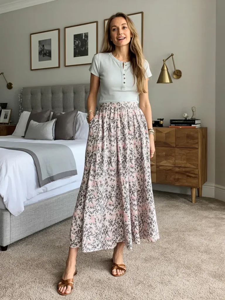 15. Soft Floral Maxi Skirt with a Fitted Knit Tee
