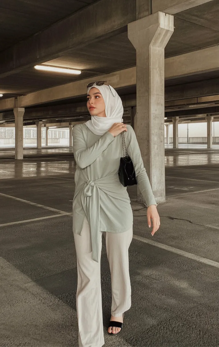 There’s such elegance in a tonal outfit when it’s done with softness instead of severity. This look feels calm, refined, and modern, with clean lines that create a beautifully balanced silhouette. The long-sleeve top, relaxed trousers, and coordinated hijab give it that polished Muslim casual energy that looks expensive without needing bold details. It’s the kind of outfit that feels quietly powerful—the sort of look that lets your presence lead. For modest summer outfits in 2026, this is exactly the kind of style women are gravitating toward: minimal, breathable, and beautifully intentional. It’s subtle, but it absolutely leaves an impression.