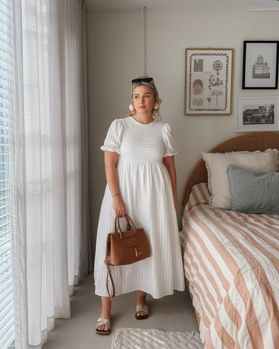 If you’re wondering what to wear this with, think soft gold jewelry, oversized earrings, a tan handbag, and neutral slides or sandals. This kind of dress loves warm accessories because they keep the white from feeling too stark. It’s perfect for Christian casual events, summer lunches, baby showers, or days when you want to feel a little more dressed without going full occasion wear. The smocking also makes it comfortable through the bust and waist, so it’s as practical as it is pretty. Very Classy, very easy, and absolutely worthy of the 2026 inspo mood board.