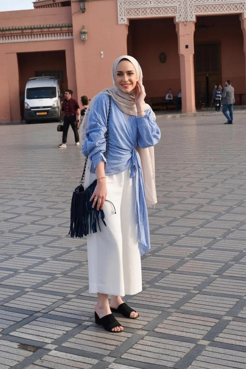 This outfit has such a bright, graceful presence. The striped wrap-style top brings shape and texture, while the flowing white skirt keeps everything soft and elegant. Add the coordinating hijab, and the whole look feels refined in that easy, modern way that never looks overdone. It’s one of those combinations that instantly reads polished but still approachable, which is why it feels so right for modest summer outfits in 2026. There’s movement, lightness, and a real sense of personal style here. For women who want something pretty and put together without losing comfort, this is beautiful Muslim casual chic Inspiration.