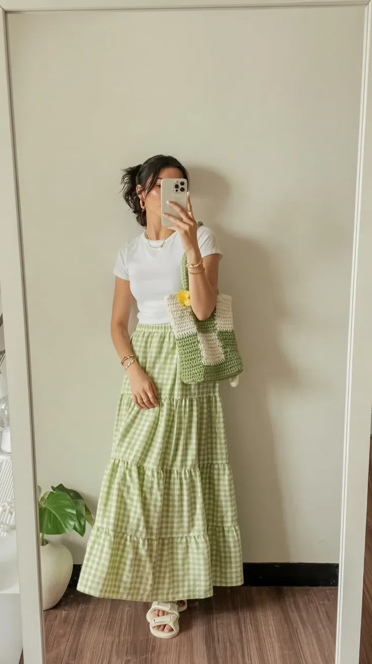 11. Green Gingham Maxi Skirt with a Clean White Tee