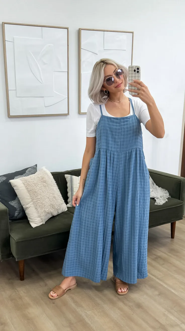 16. Blue Gingham Wide-Leg Jumpsuit Over a White Tee