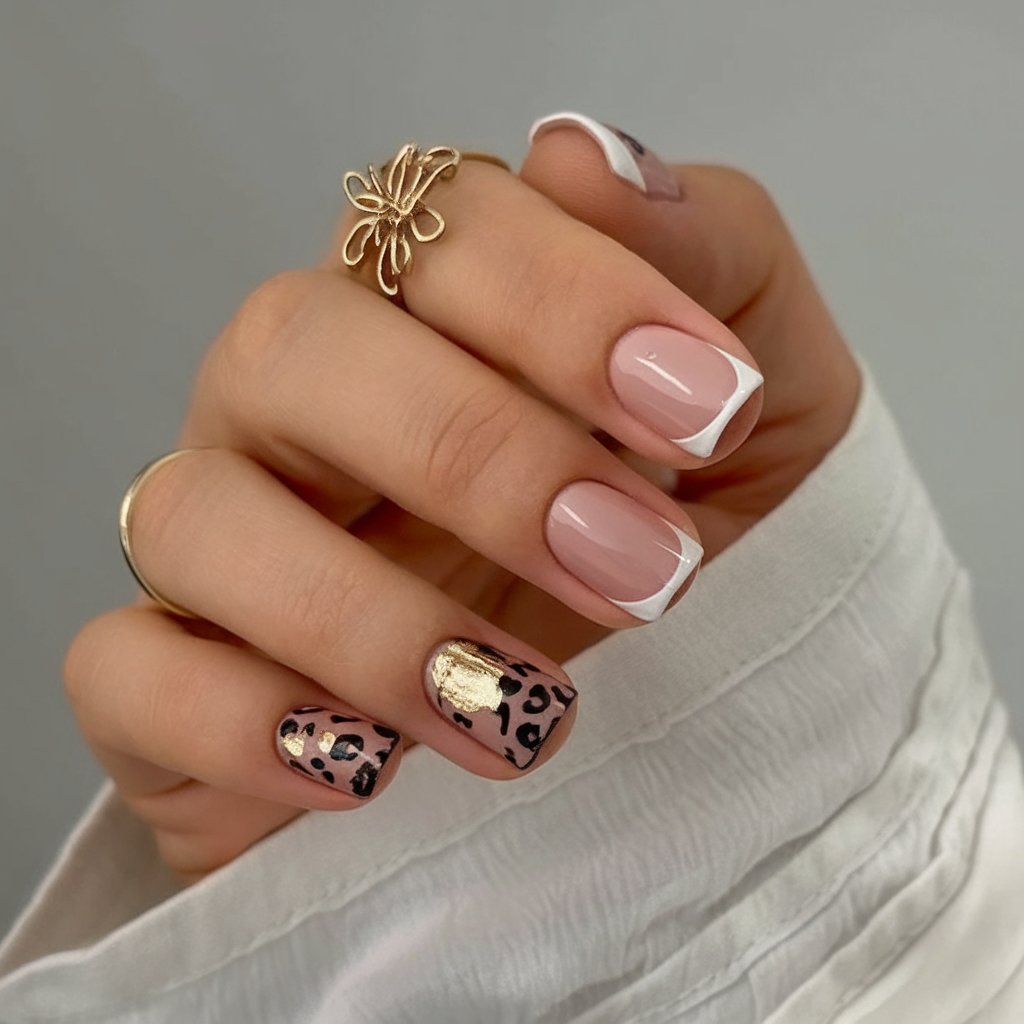 Traditional meets ferocious, in this combination of simple French tip, leopard print and wild strip of gold foil. It is sophisticated, yet slightly edgy, such as a blazer on top of a band T-shirt.