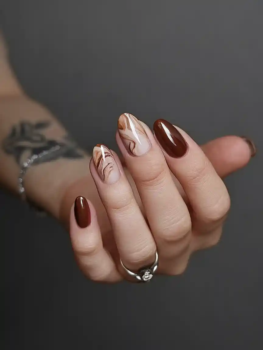 This swirl design in creamy caramel and espresso colors is a version of your favorite latte at the nails level. Together with dark brown gel nails, it feels friendly, warm, and so fall.