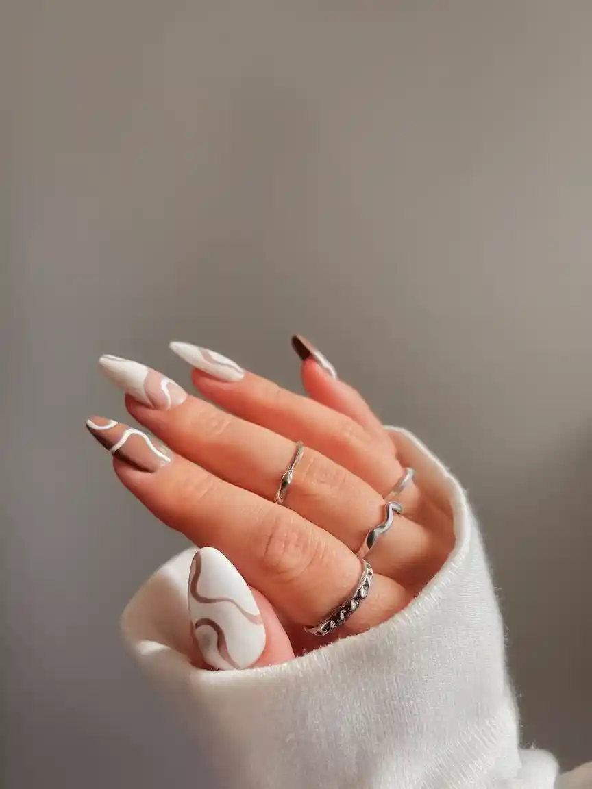These all-white almond nails are given a fancy touch of the abstract mocha brown waves which are artistic and yet clean. The lines energy is added to the movement without being allowed to be loud, like a minimalistic painting on finger tips.