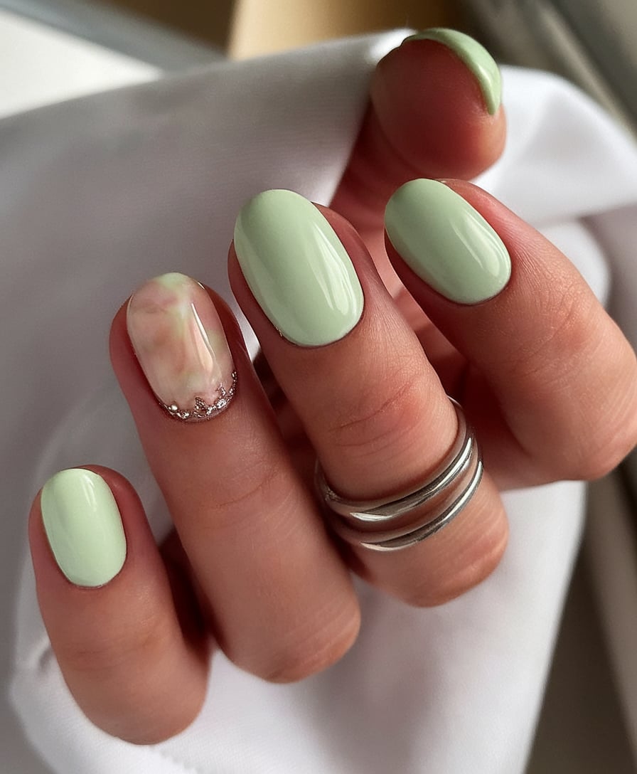 Sage green reminds you of a fresh air of tranquility in this relaxing minimalistic mani. Accent nail made of marble and small rhinestones makes the appearance elegant and with a spa-like vibe.