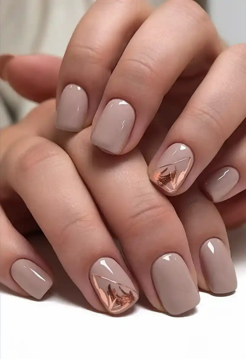 And also, this will suit you, in case you love neutrals but feel the need to add some glimmer to it. These glossy taupe nails get an upscale touch of a copper foil tip-it has the shimmer that catches the eye to make you look the best.