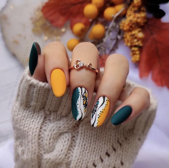 This nail design captures the essence of fall with its warm, earthy tones. The mix of mustard yellow and deep teal creates a cozy, inviting look perfect for the season. The intricate leaf pattern adds an artistic touch, making it ideal for those looking to embrace the fall colors in a unique way. The matte finish on some nails contrasts beautifully with the glossy art, giving it a sophisticated edge.