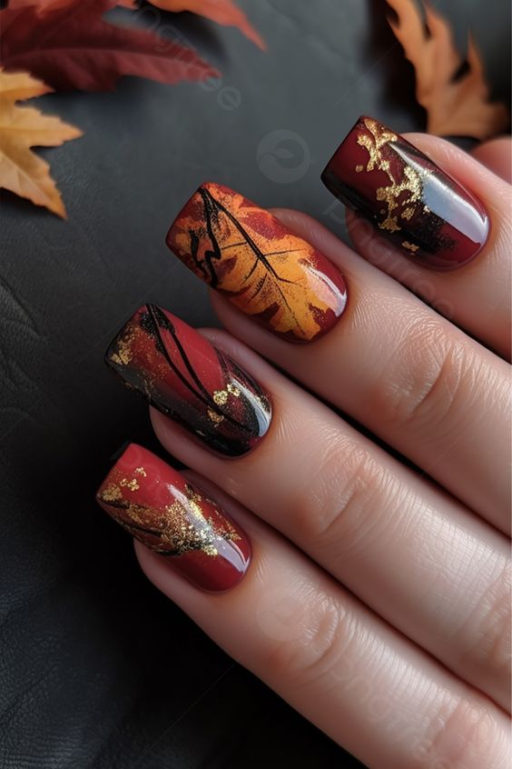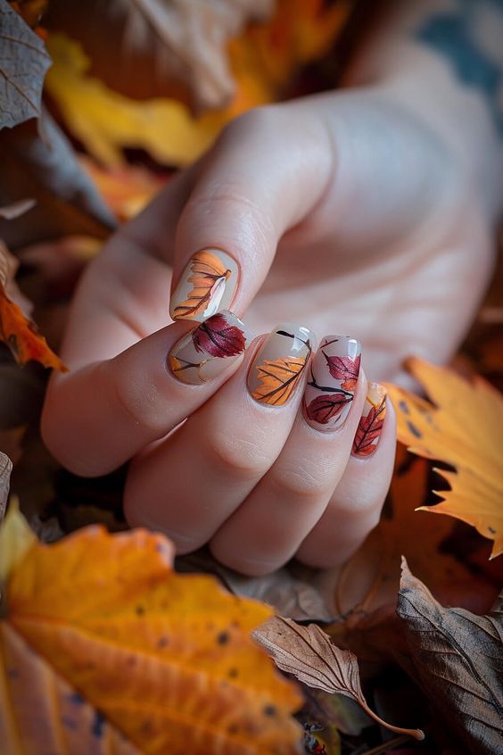 For a softer take on fall nails, this design uses delicate leaf patterns in shades of red, orange, and yellow. The neutral background allows the colors to stand out, making it a perfect choice for a subtle yet seasonal look. This fall short nail design is great for everyday wear.