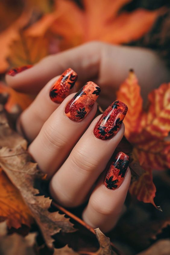 This nail design features a vibrant orange and black palette, reminiscent of a fiery fall sunset. The glittery base adds a touch of sparkle, while the black leaf patterns create a striking contrast. This fall inspo is perfect for those who want their nails to capture the dramatic beauty of autumn leaves.