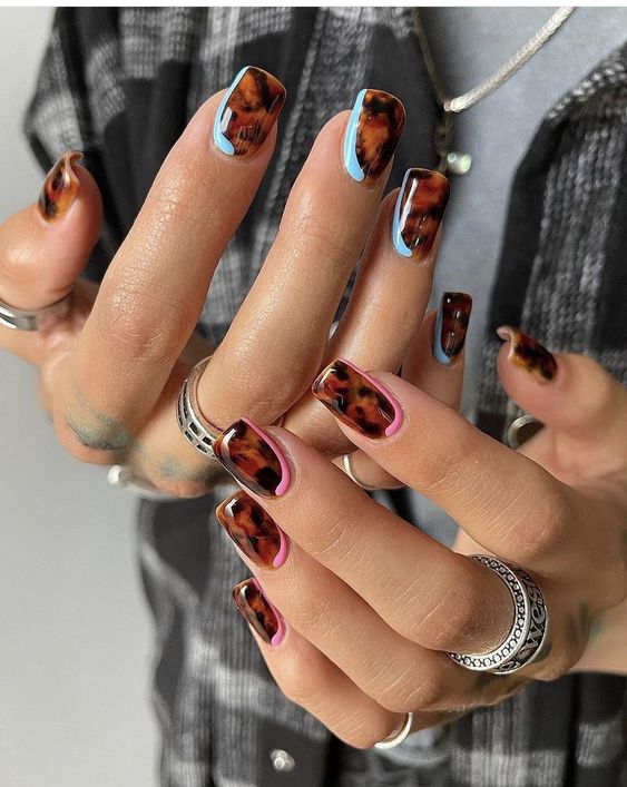Tortoiseshell designs are making a comeback, and this nail art combines them with fun, colorful accents. The brown and black pattern is enhanced with touches of pink and blue, adding a modern twist to a classic design. This fall gel design is perfect for anyone looking to try something trendy and unique.