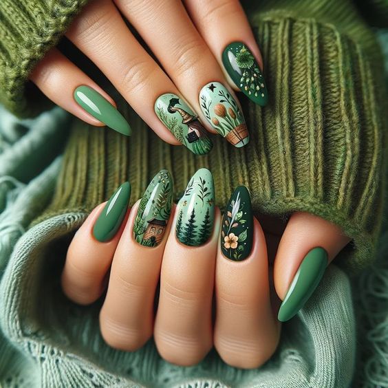 This whimsical nail design captures the magic of an enchanted forest. The deep green base is adorned with intricate forest scenes, including trees, mushrooms, and tiny woodland creatures. This fall inspo is perfect for nature lovers and those who appreciate detailed nail art.