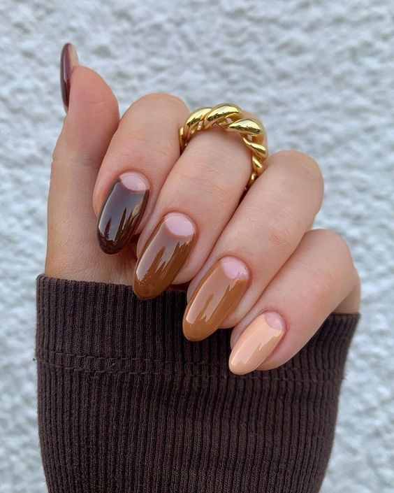 For a more minimalist approach, this nail design features various shades of brown, creating a cozy and sophisticated look. The matte finish adds a modern touch, making this fall almond design perfect for everyday wear. The gradient effect ensures that each nail is unique while maintaining a cohesive look.