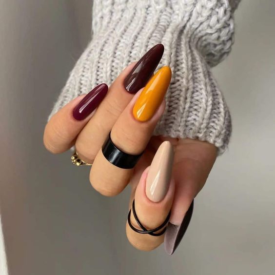 For those who love to make a statement, this nail design is a perfect choice. Featuring rich burgundy, bright yellow, and a nude accent, this combination is both bold and elegant. The glossy finish enhances the colors, making them pop. This fall design is perfect for anyone looking to add a touch of drama to their look while staying on-trend with fall colors 2024.