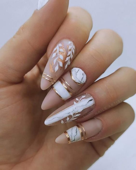 This nail design combines elegant marbling with delicate leaf patterns, creating a sophisticated and stylish look. The white and gold colors are perfect for fall, adding a touch of luxury to your nails. This fall almond design is ideal for those who want to embrace the season in a chic and refined way.