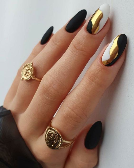 Simplicity meets sophistication with this black and gold nail design. The matte black nails provide a perfect backdrop for the gold accents, creating a luxurious and chic look. This design is perfect for those who prefer simple Halloween nails that still make a statement. The monochrome palette ensures that this style remains timeless and versatile.