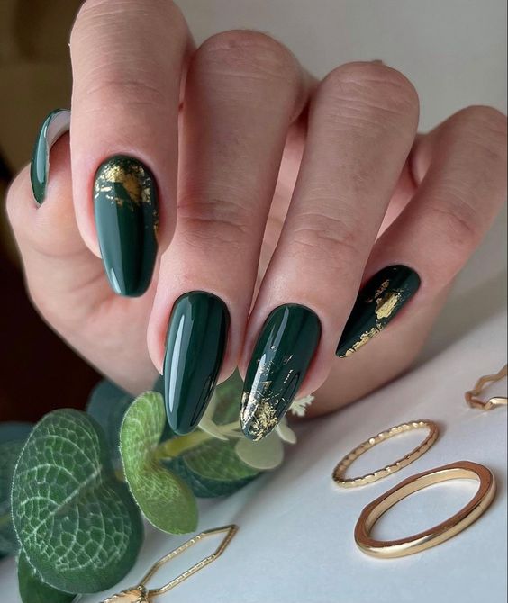 Embrace the deep, rich tones of a forest in fall with this stunning green and gold design. The glossy finish on the dark green nails is complemented by gold foil accents, adding a touch of glamour. This fall design is perfect for those who love nature-inspired looks and want to incorporate fall gel nails into their style.
