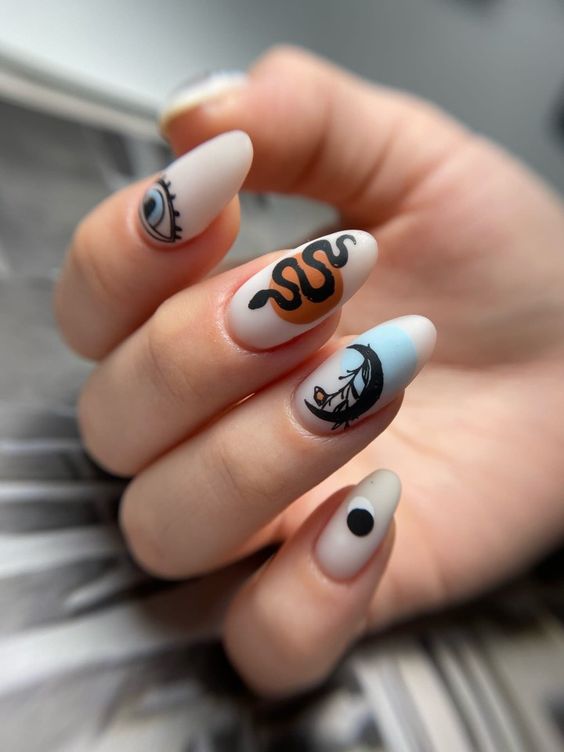 This unique nail design combines various artistic elements for a truly eye-catching look. The matte finish allows the intricate patterns to stand out, making it perfect for those who love creative nail art. The use of bold colors and detailed designs makes this a standout choice for anyone looking to express their individuality.