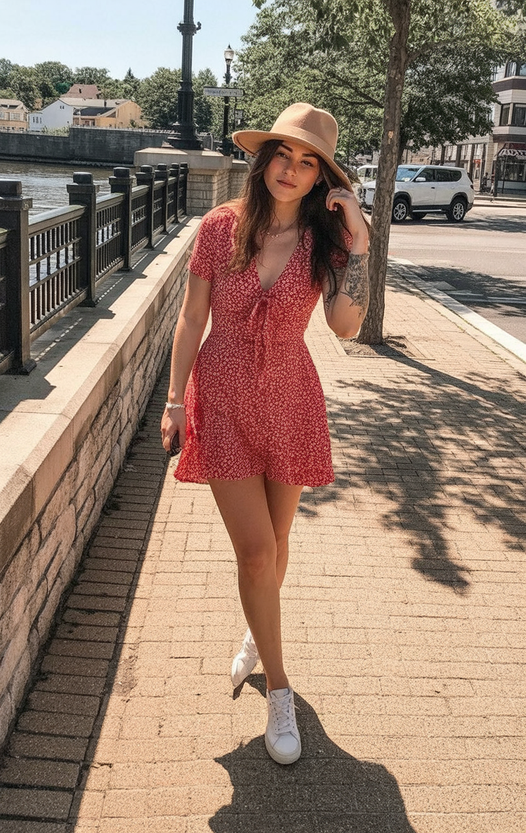 This red floral mini dress is the kind of piece you slip on when you have ten minutes to get ready and still want to look like you planned everything. The print is lively without being loud, and the fluttery hem makes every step feel a little flirty. Topped with a wide-brim hat and grounded with white sneakers, the look feels perfect for strolling along the river before spreading out a blanket. It is a great Inspo option for women who love feminine pieces that still have a little edge.