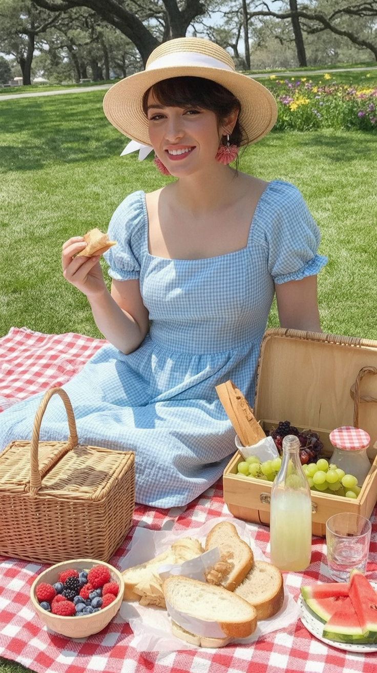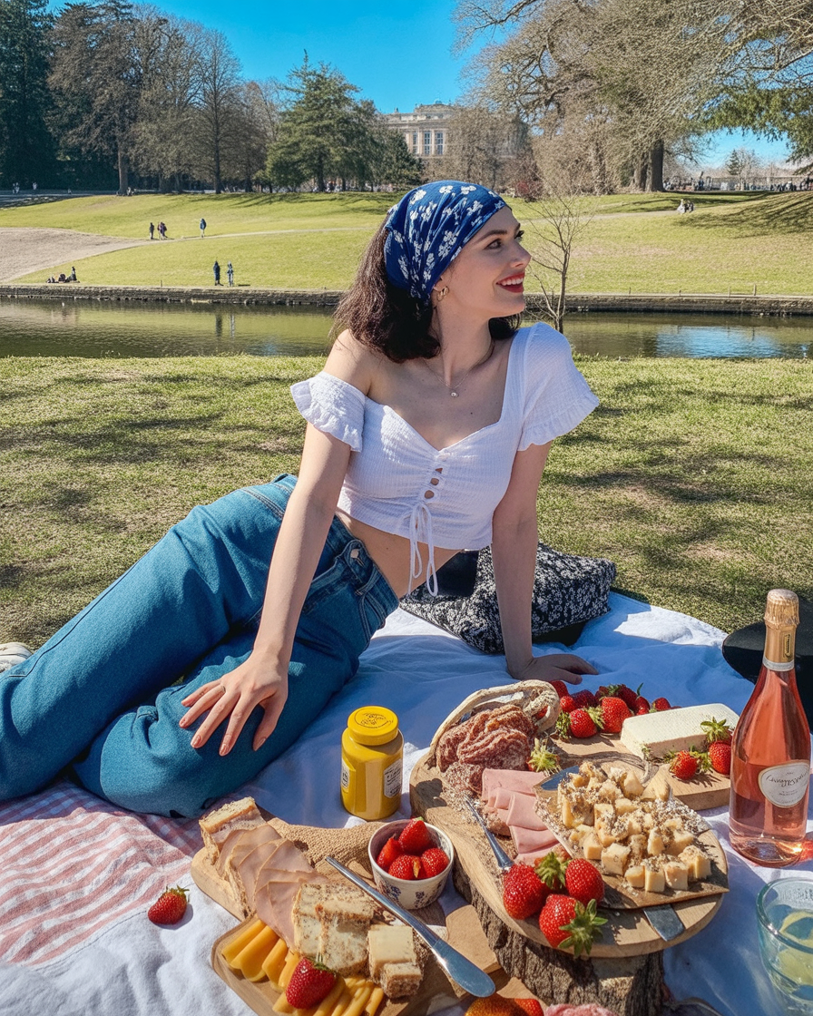 What makes this look special is the way it bridges city and country. Jeans give you coverage and comfort—perfect if you’re walking, sitting on rocks, or exploring a park trail—while the gingham and beret add that aesthetic flair that makes even a budget picnic feel elevated. Compared with a dress, this combo feels more grounded and adventurous, ideal for women who like their spring picnic looks with a little wanderlust and a lot of freedom to move.