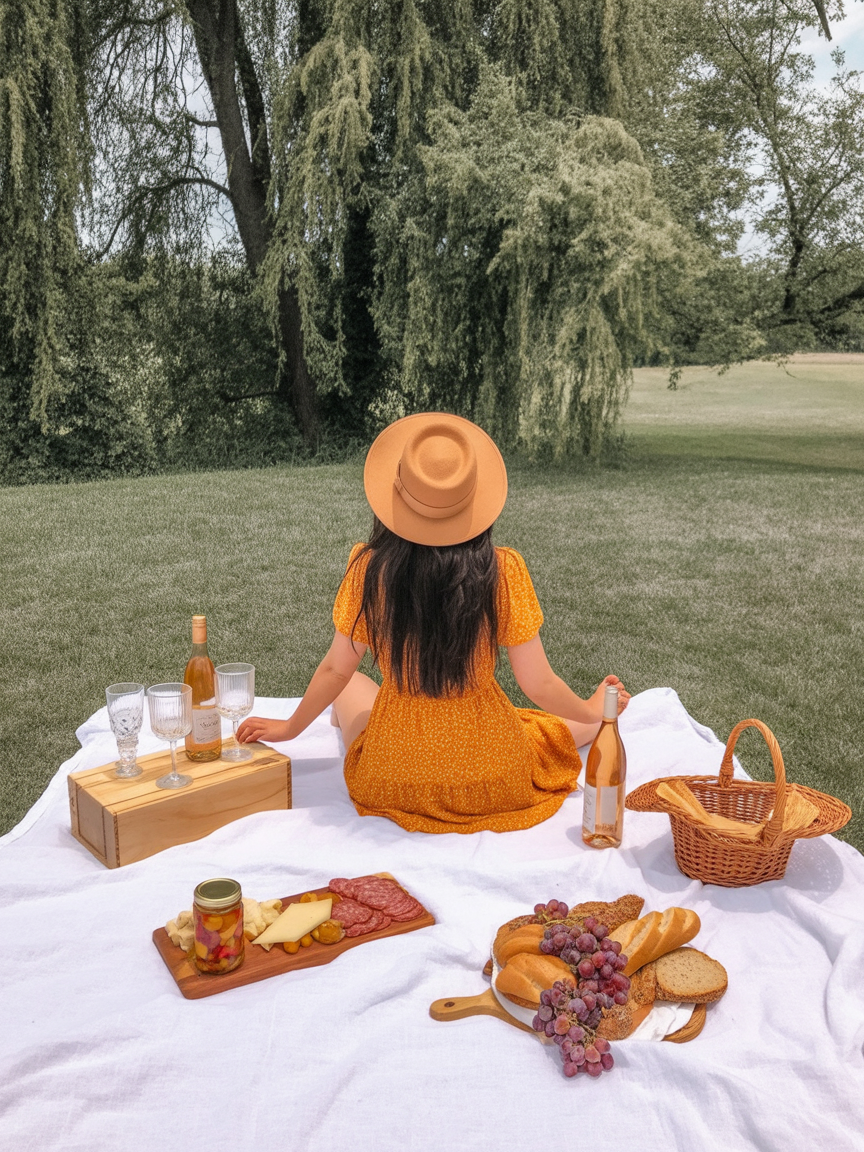 There’s something magical about a warm golden dress against a field of green, especially when you’re sitting on a simple white blanket with a rustic spread of bread, cheese, and wine. This little number captures that mood perfectly—softly fitted at the waist, swishy at the hem, and finished with a matching hat that frames the moment beautifully from behind. It’s one of those picnic outfits 2026 that looks almost too pretty to be real, like a still from a movie you’d love to star in.