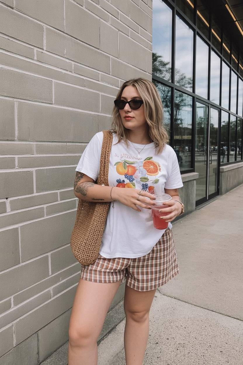 For days when you are heading from errands straight to a picnic, a fun graphic tee and plaid shorts combo is a budget-friendly winner. The fruit print on the shirt keeps the mood light and summery, while the brown checks on the shorts add a subtle retro touch that feels very 2026 street style. A woven tote, sunglasses, and slides make this a great park or work-from-cafe outfit that transitions seamlessly into an evening on the grass with friends, snacks, and maybe a chilled drink.