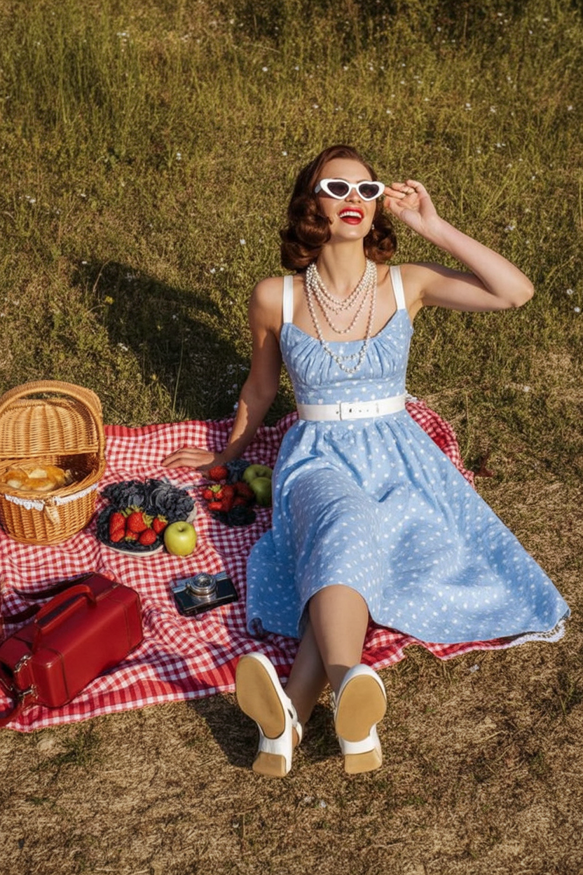 There is something wonderfully movie-star about this picnic outfit, as if you just slipped out of a 1950s romance and landed on a gingham blanket. The soft blue dress, cinched at the waist and dotted with tiny white specks, feels timeless yet fresh for women who love a feminine aesthetic. Pearls, cat-eye sunglasses, and a swipe of red lipstick turn a simple outdoor moment into a full-on main-character scene, perfect for spring or summer afternoons in the park when you want your spring picnic looks to feel a little extra.