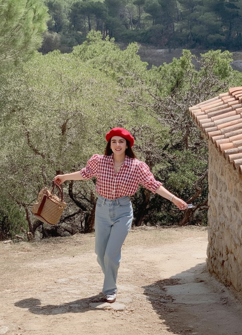 If you’ve ever wanted to live out your French countryside fantasy without leaving your neighborhood, this outfit is your sign. A red gingham shirt tucked into light-wash jeans, paired with a jaunty beret and a woven basket bag, gives instant storybook charm while still feeling practical enough for dusty paths and uneven lawns. It’s picnic style with personality, mixing nostalgic school-uniform checks with grown-up accessories in a way that feels playful but never childish.