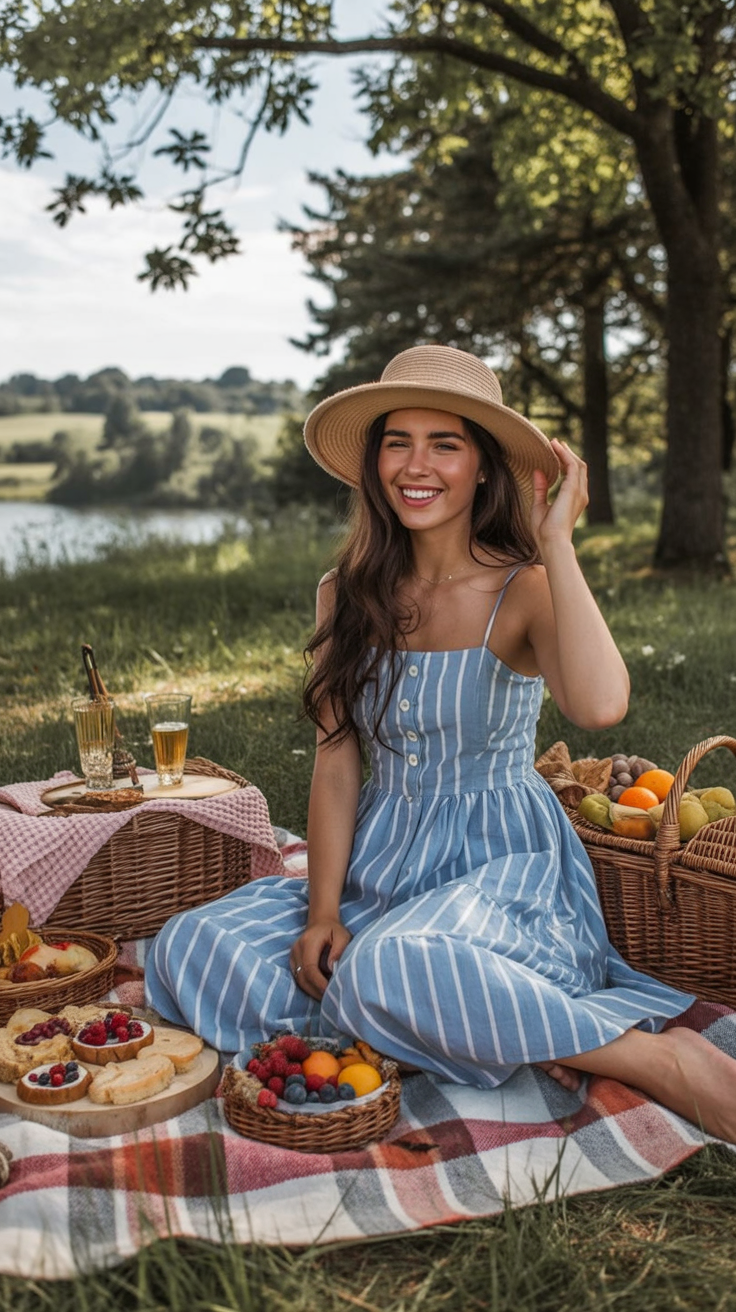 The attitude of this outfit is calm, open, and quietly confident. It does not shout for attention, but it photographs beautifully and makes you feel like your best self, whether you are with family, friends, or on a date. The striped pattern lengthens the body, which can be especially flattering if you are petite, and the breathable fabric works from late spring through early autumn. If you want a picnic outfit that radiates ease and grace without a lot of styling, this one nails that gentle, contented mood.