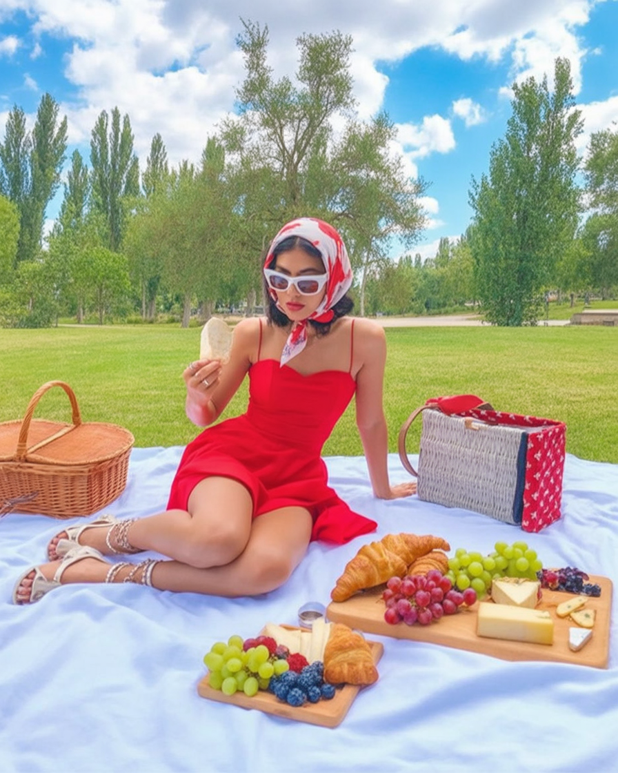 If you’re craving a little main-character moment, this bright red mini dress will happily deliver. The slim straps, structured bodice, and swishy skirt feel glamorous yet playful, especially when paired with white sunglasses and a printed scarf tied around the hair. Laid out on a pale blanket surrounded by croissants, grapes, and cheese, this look leans into retro glamour without feeling like a costume—more “old Hollywood star on a day off” than anything else.