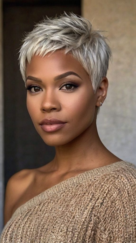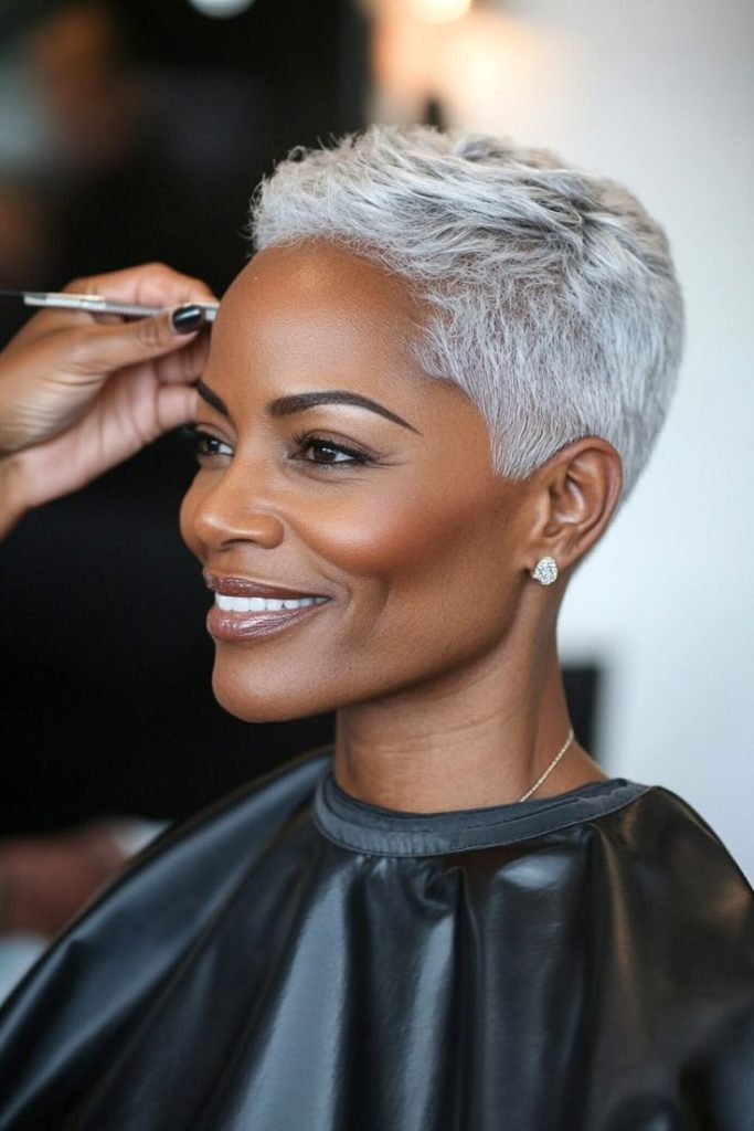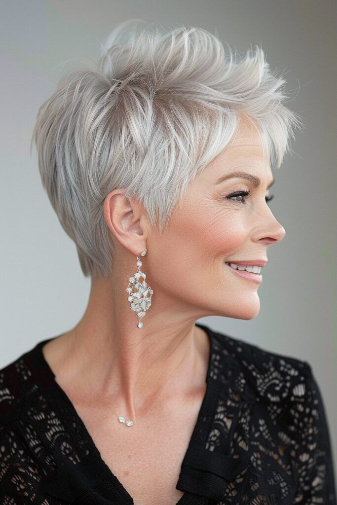 For women embracing their natural gray, the spiky silver pixie is a striking choice. This ultra-short cut with sharp, defined layers creates a bold, edgy aesthetic that’s perfect for women over 60. The height at the crown adds volume, making it a great option for fine hair.
