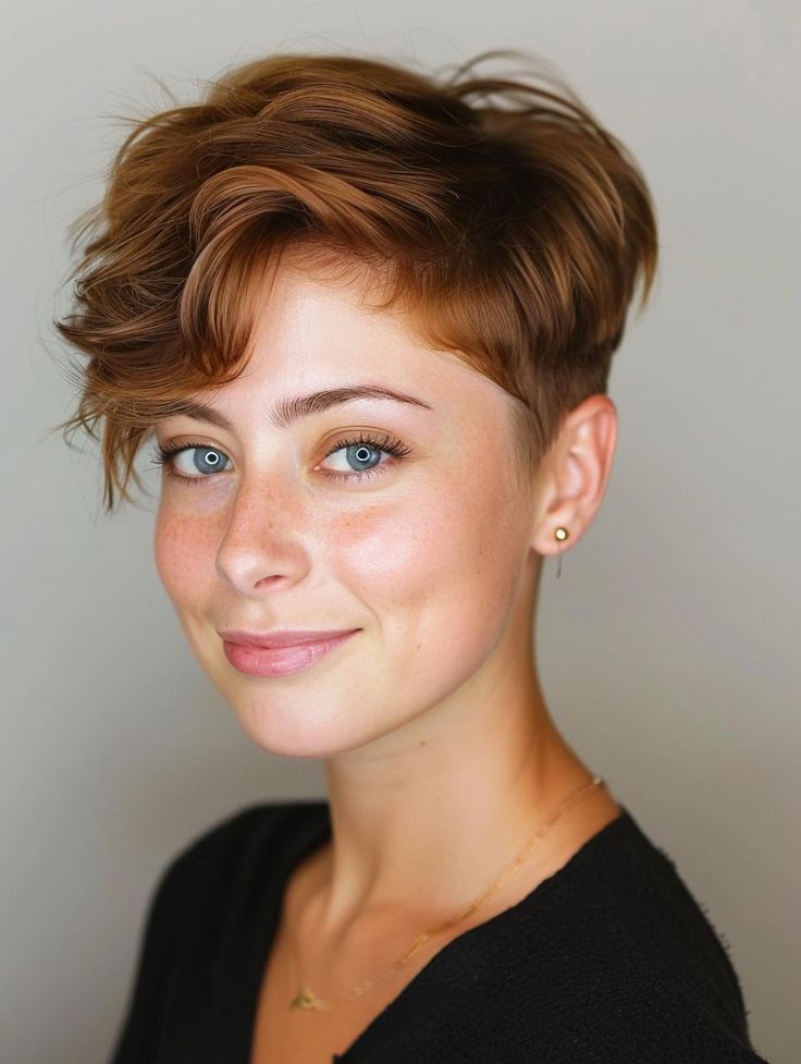 This auburn pixie with side bangs brings warmth and vibrancy to any look. The rich auburn color complements various skin tones, while the side bangs add a playful yet sophisticated element. This hairstyle is perfect for women in their 30s and 40s who want a stylish and versatile cut.