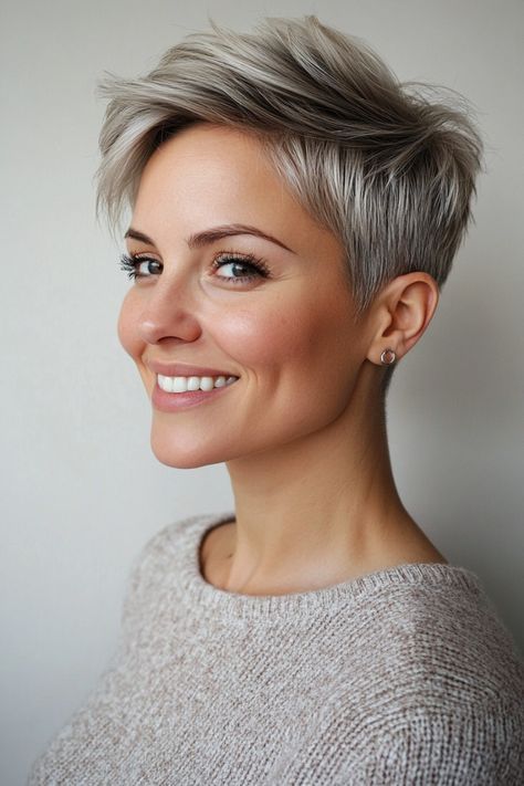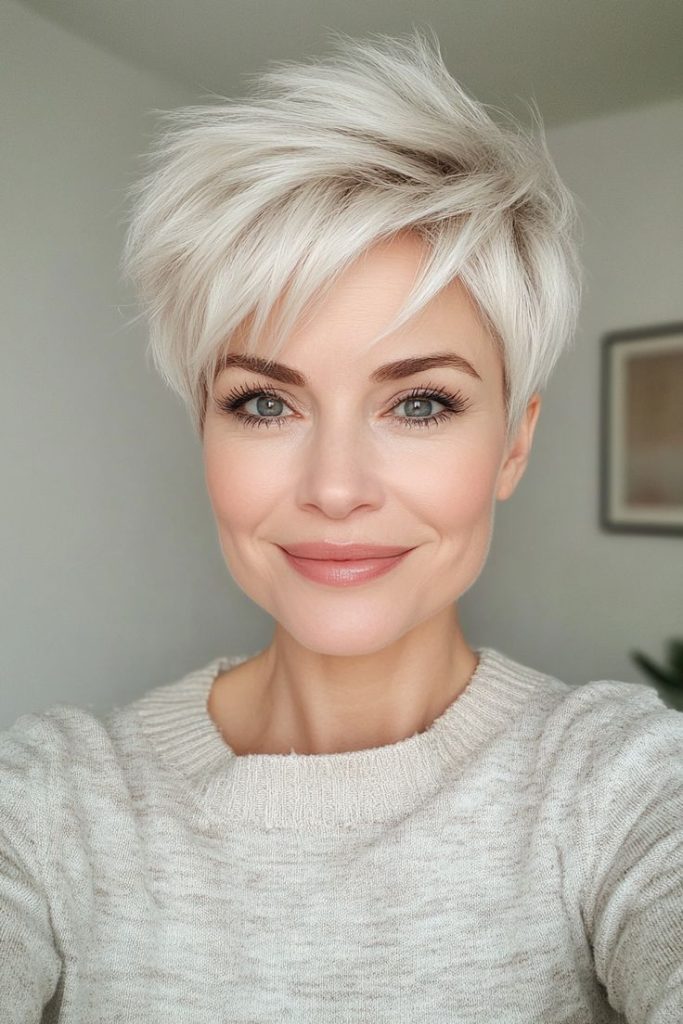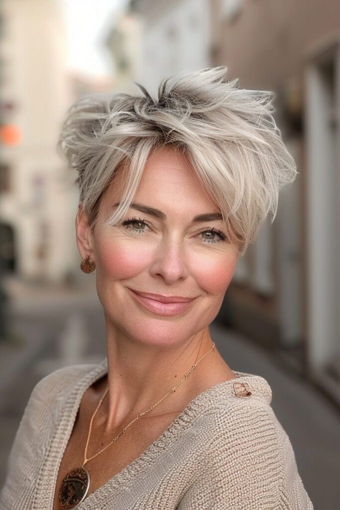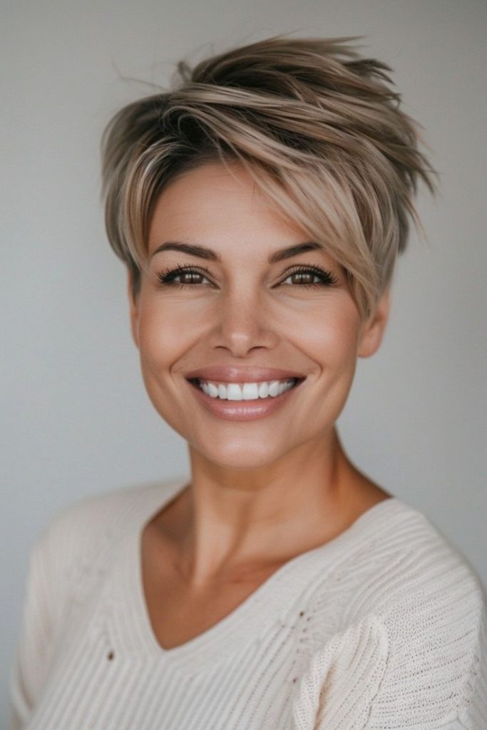This voluminous pixie cut features longer layers on top, providing height and texture that’s ideal for women over 40. The soft side-swept bangs add a touch of elegance, making this style suitable for formal and casual occasions alike. Its voluminous top creates the illusion of thicker hair, making it a perfect choice for those with fine hair.