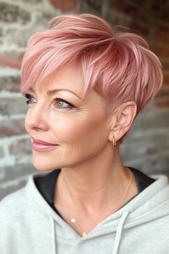 For those who love experimenting with color, the pink pixie is a playful and eye-catching option. The soft pink hue adds a fun twist to the classic pixie, making it ideal for women in their 30s and 40s who want to showcase their vibrant personality. The subtle layers and side-swept bangs keep the style feminine and chic.