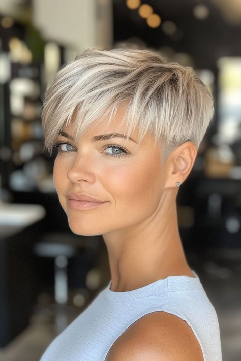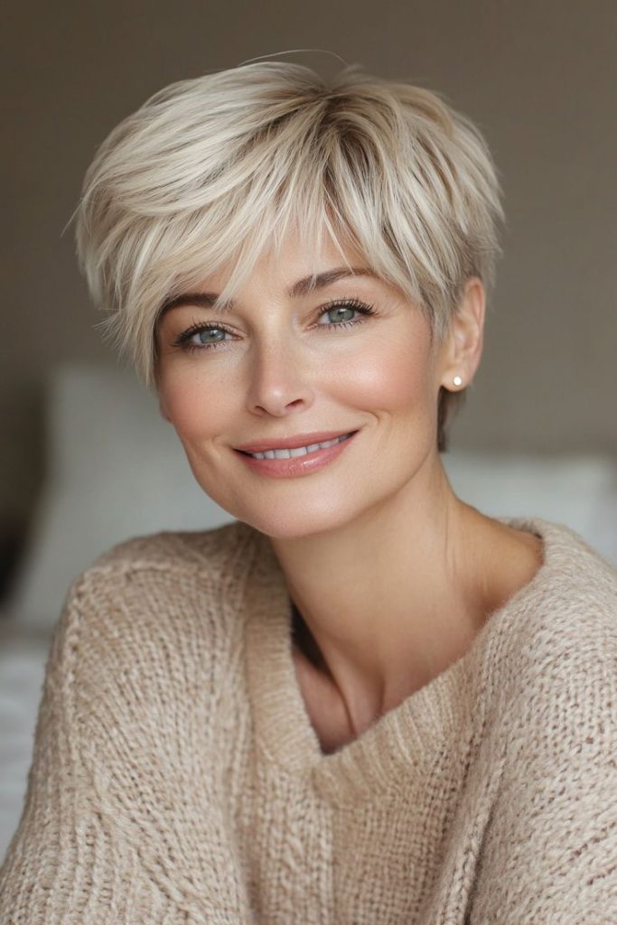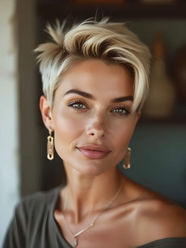 The sleek blonde pixie exudes confidence and sophistication. With its polished layers and slightly elongated bangs, this cut works exceptionally well for women over 40 who prefer a modern yet elegant look. The bright blonde shade enhances skin tone, while the sleek finish adds a touch of glamour.