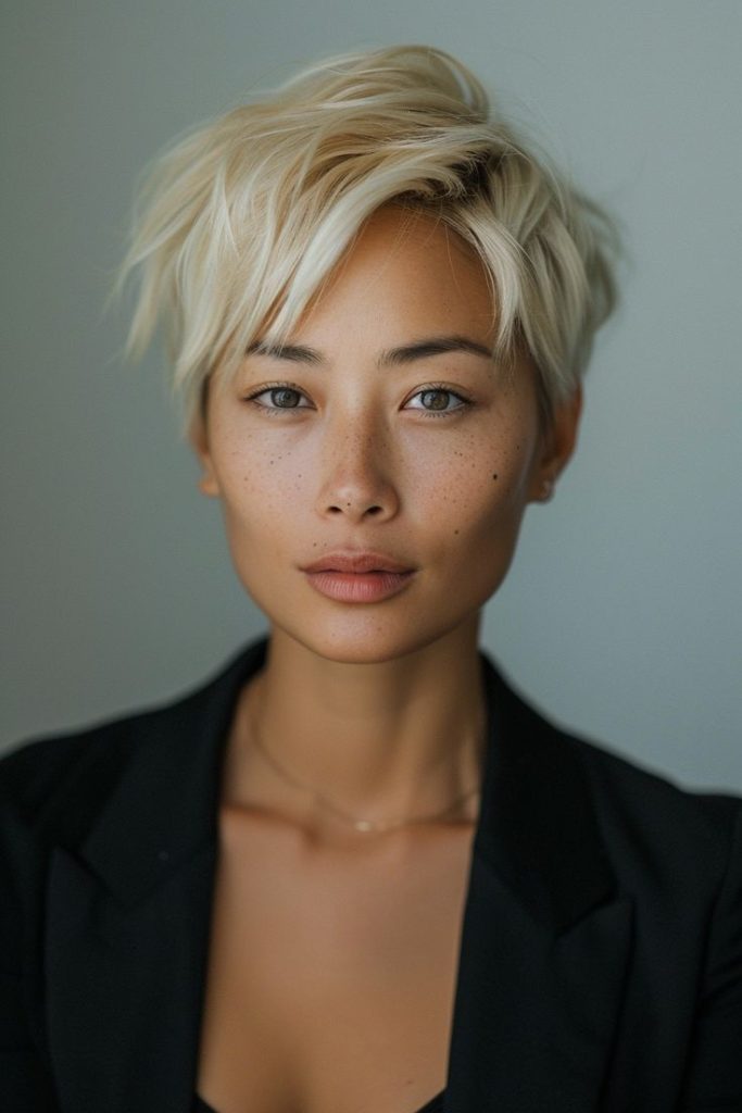 The minimalist pixie is all about clean lines and simplicity. With its sleek finish and understated elegance, this cut is perfect for women who prefer a no-fuss hairstyle. The slightly longer top layers provide versatility, while the short sides keep the style neat and polished.