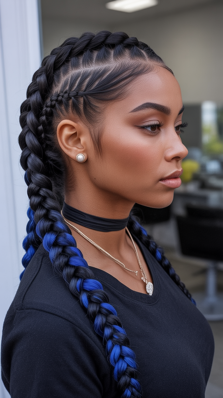 These classic Dutch braids get a bold 2025 upgrade with striking blue color accents peeking through. The braids stay tight to the scalp, making them gym-proof and eye-catching.