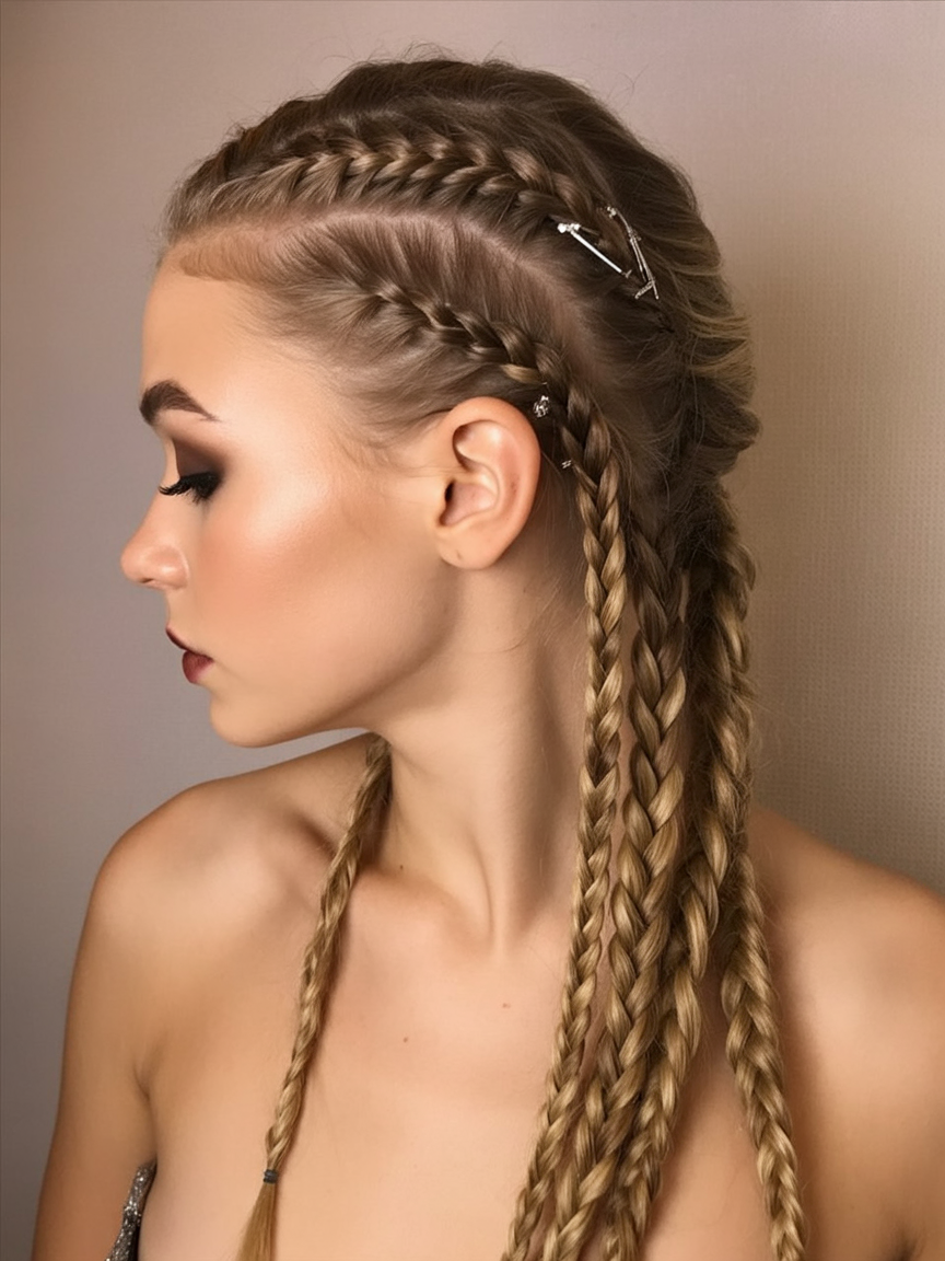 This look is all about structured drama with a playful edge. The multiple braids sweep back into a fierce side fall, and those silver pins tucked between the plaits? They give just the right touch of rebel-glam. It’s giving confident, it’s giving runway-ready—but still totally wearable on a regular Tuesday.