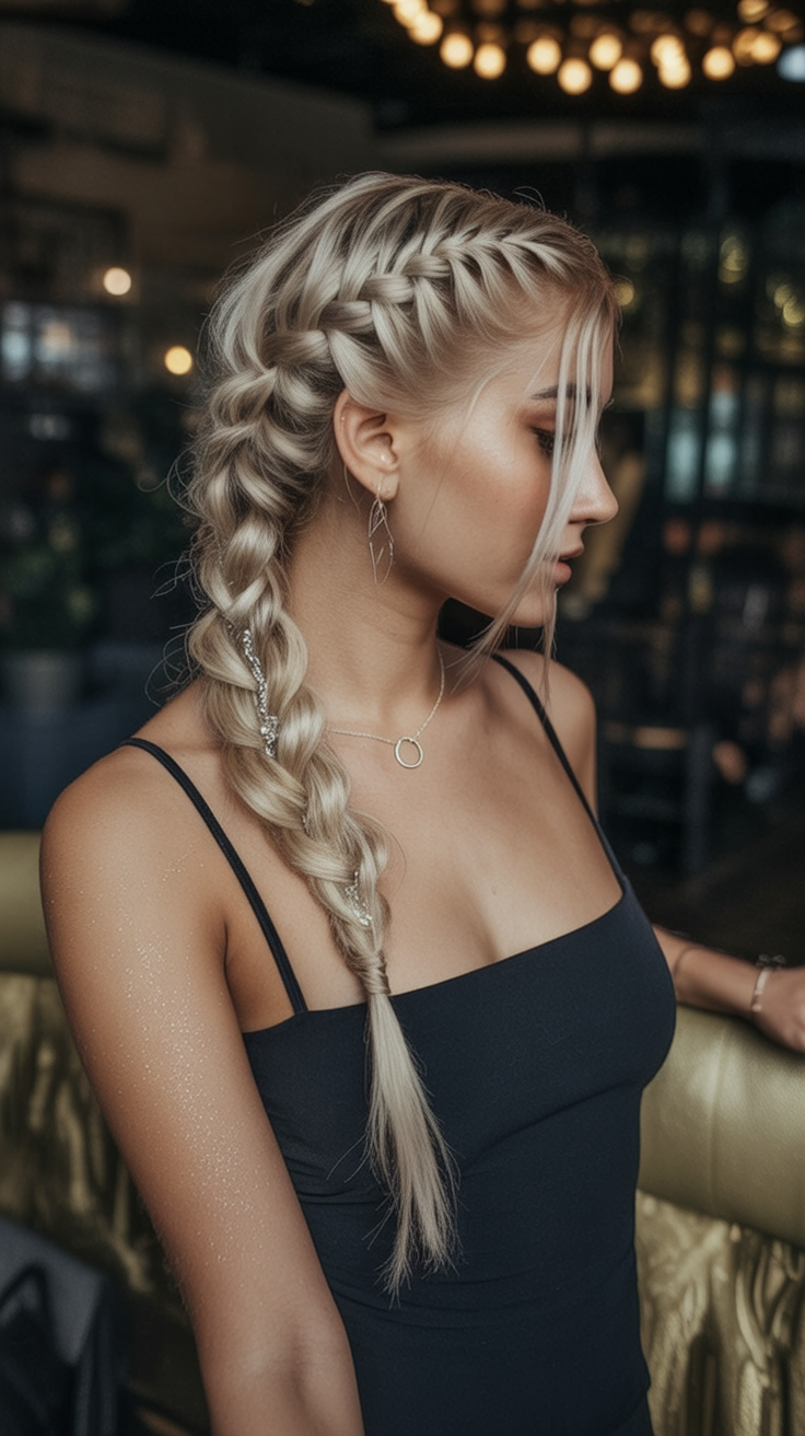 This romantic over-the-shoulder braid sparkles with tiny pin accents. It’s flirty, flowy, and perfect for evenings out or soft daytime glamour. It’s a braid with a whisper, not a shout.