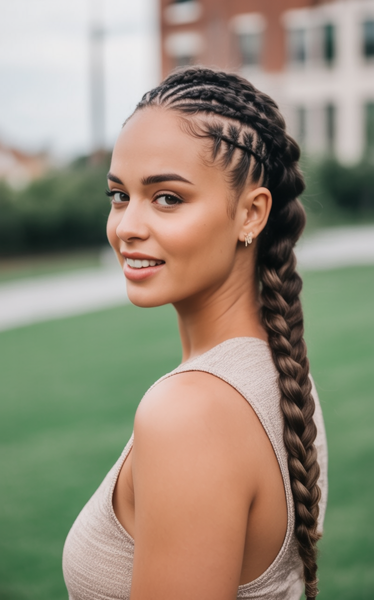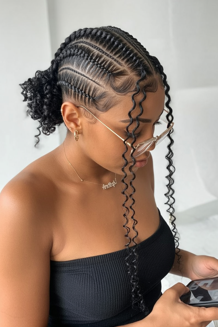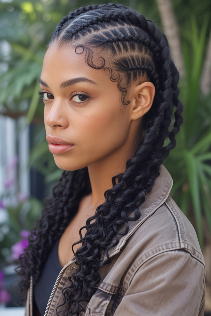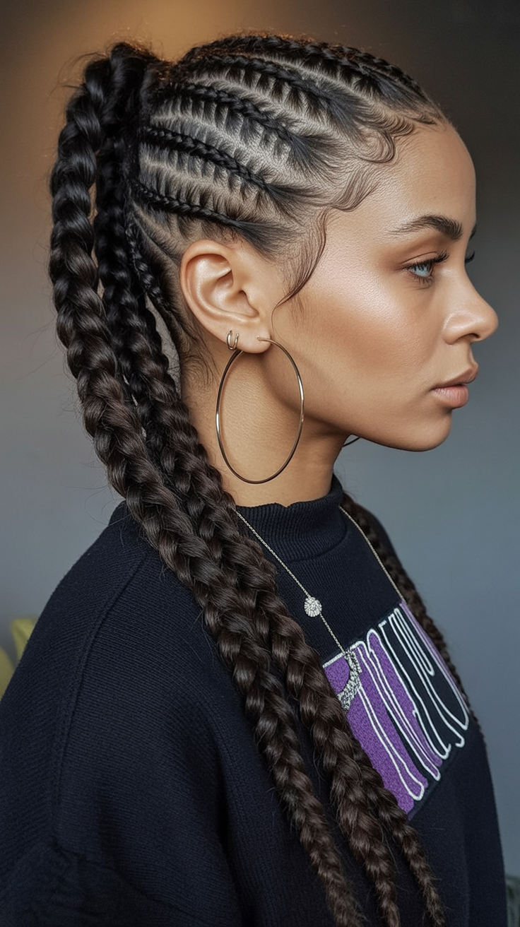 Sharp and structured, this cornrow ponytail exudes power. It pulls the hair tight to the scalp in uniform rows before flowing into a set of thick braids in the back. The look is polished, modern, and full of attitude.