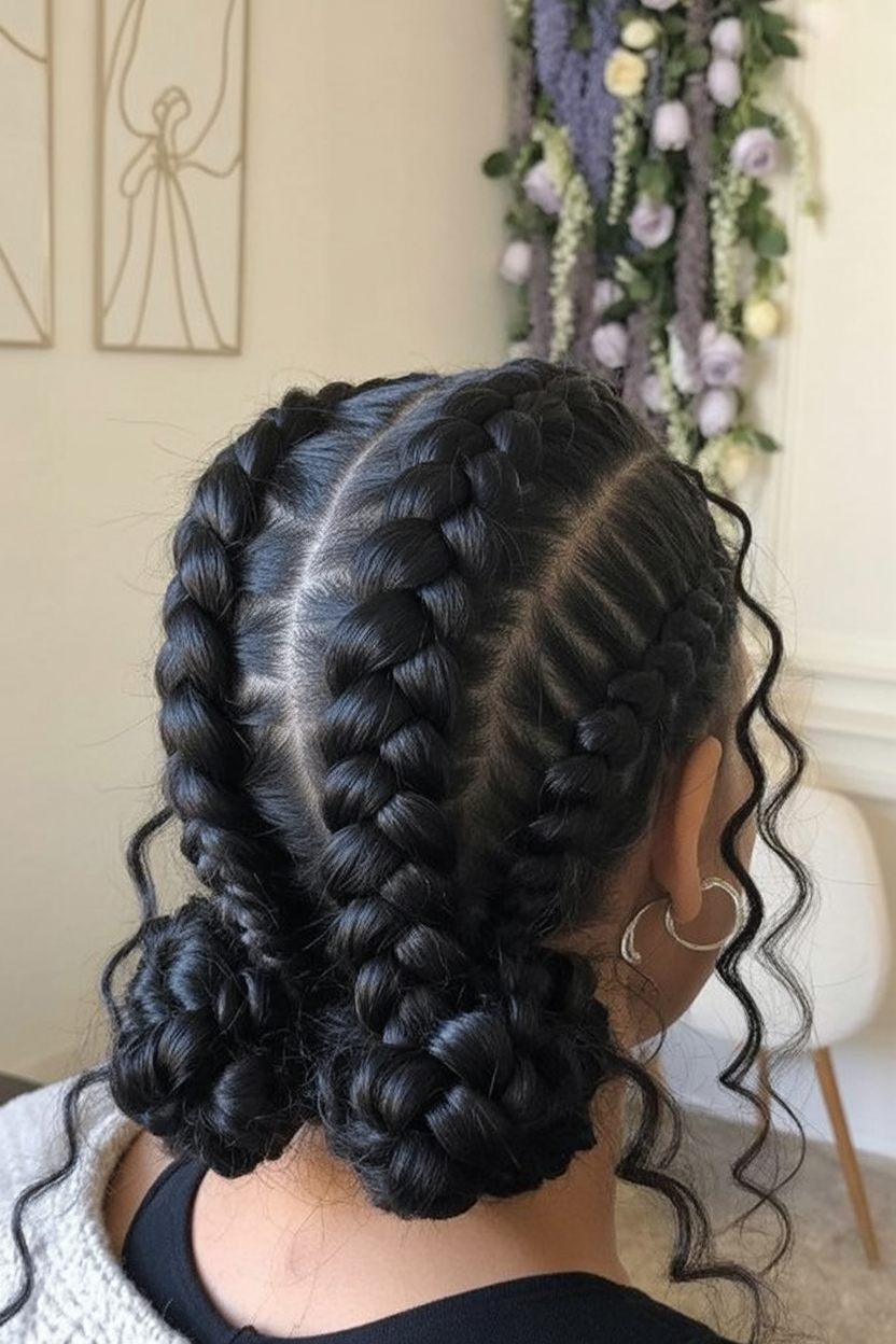These double buns are full of charm and practical flair. The braids feed into low knots that keep things secure while giving major youthful energy—a perfect blend of classic and cool.