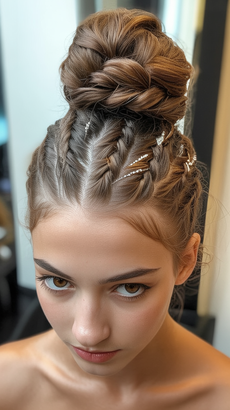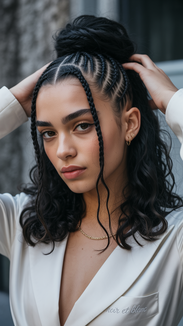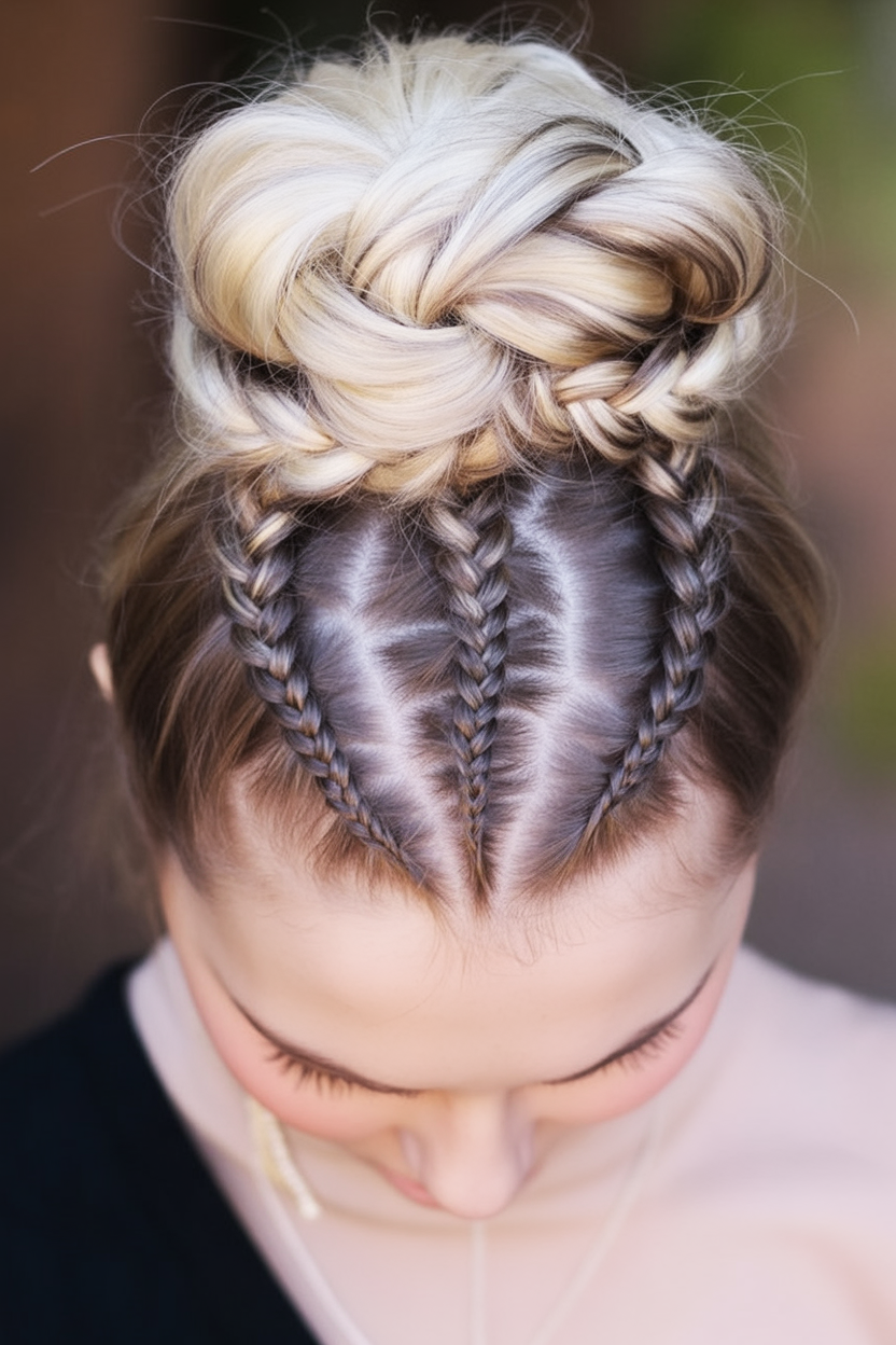 There’s something undeniably chic about the contrast of tight, small braids flowing into a voluminous blonde top bun. It’s tidy, elevated, and just daring enough to feel modern.
