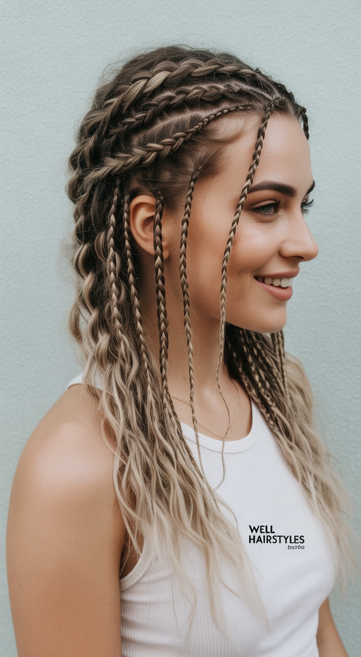 When you want something that feels playful but still polished, this braid-meets-wave look delivers. The top is structured with tightly pulled braids while the ends fall into effortless beachy waves.