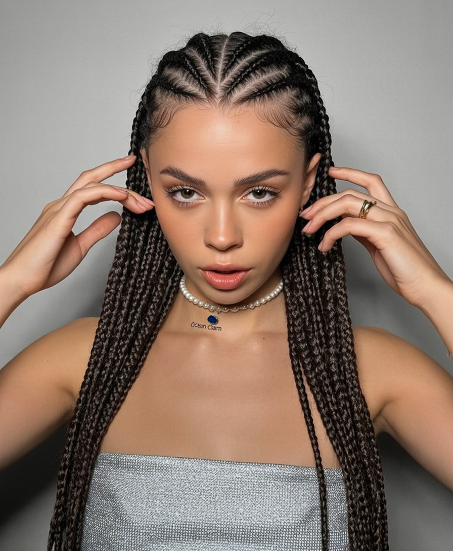 There’s something effortlessly polished about this look—it strikes the perfect balance between sleek and statement. The clean straight backs flow into one long, neat braid down the back, creating a timeless silhouette with major presence.