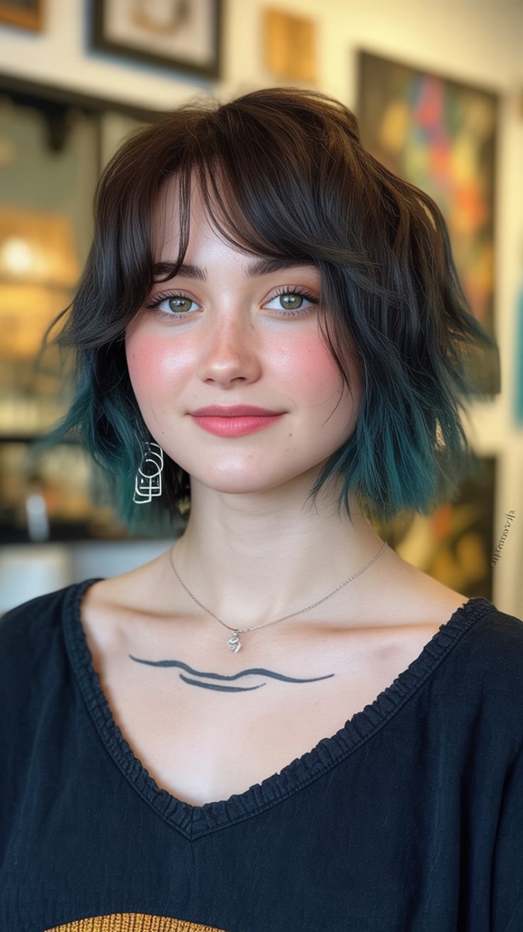 A shaggy bob gets an artsy twist with sea-blue tips and airy bangs skimming the brows. The texture feels beachy and free, the length brushes the neck, and the color play adds a quiet thrill without taking over. It’s creative yet wearable, perfect for anyone who wants a wink of color that looks chic with a black tee or a silk blouse. Think modern, soft, and a touch adventurous—right on cue for 2026.
