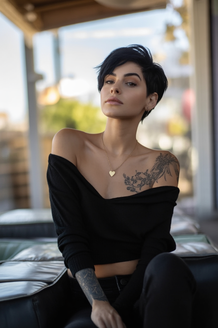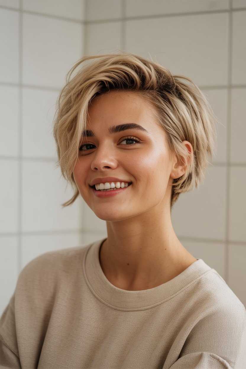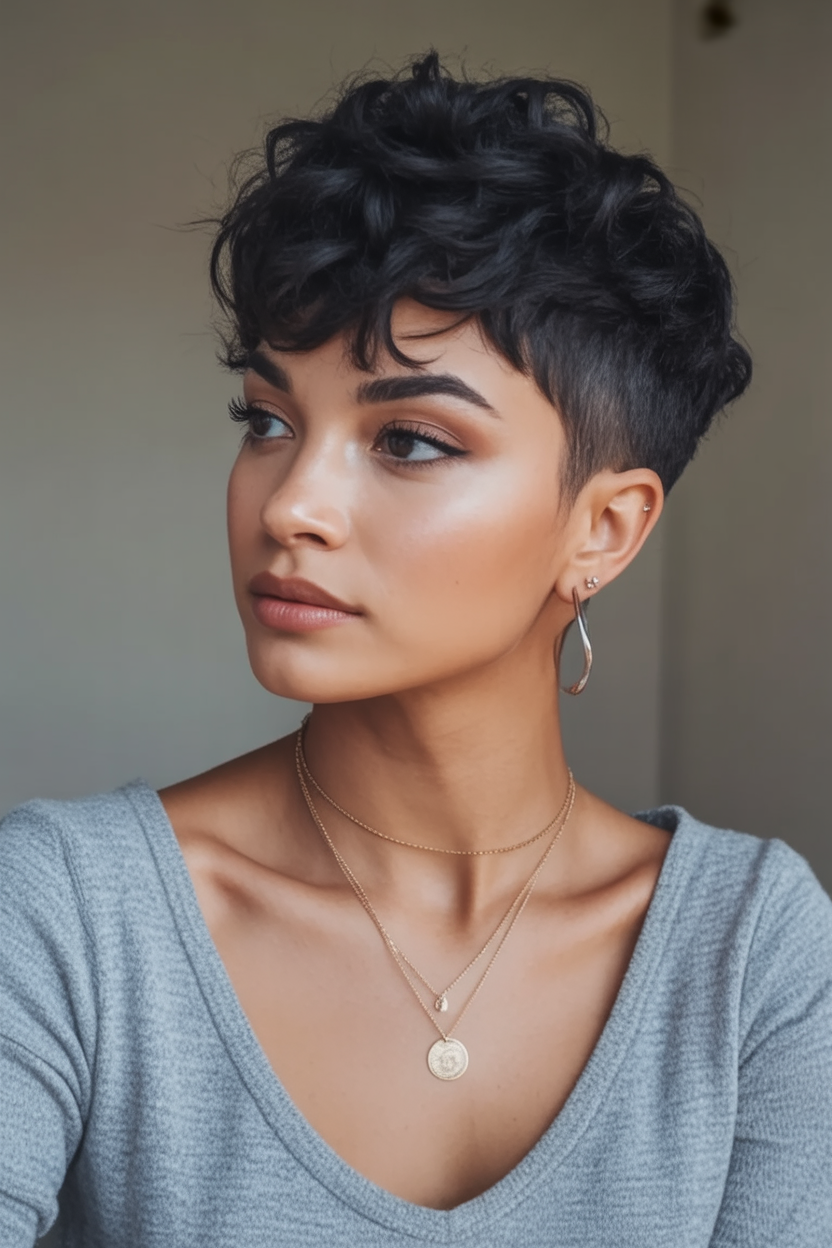 Who it’s for: brilliant on an oval face or round face that wants more structure, and a favorite for thin hair or fine hair thanks to the crown lift. If you have straight hair, use a light mousse and quick diffuser pass to coax that tousle. For curly or wavy hair, scrunch in cream and air-dry. Ask your stylist for a cropped bob-adjacent pixie with internal layering and soft framing bangs. Styling stays Easy: finger-set, a touch of paste at the ends, and go—perfect for wedding guest weekends or everyday elegance.