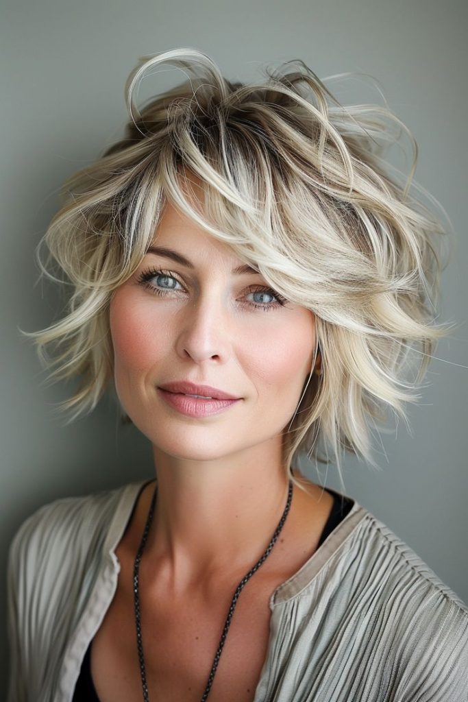 This modern short shag haircut features soft, tousled layers that add volume and movement to fine hair, making it appear fuller and more dynamic. The subtle highlights and lowlights create depth, making this style ideal for women seeking a natural, sun-kissed look. With its delicate layers, this hairstyle is perfect for women over 50, offering a youthful, rejuvenating vibe.