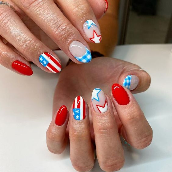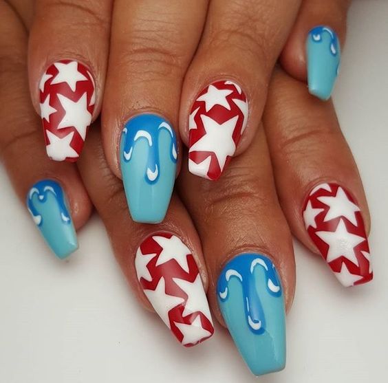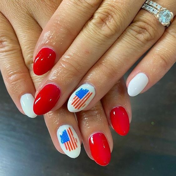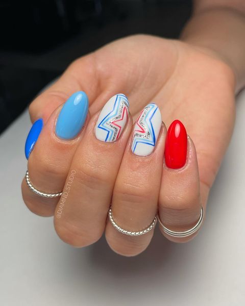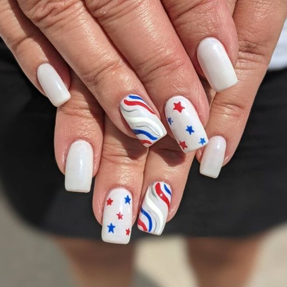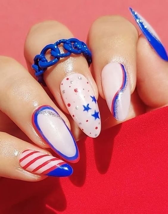 Simple Fourth of July nails almond shape provides a sophisticated canvas for any design. Elegant sweeps of blue and red on a white base can give your nails an artistic and refined look.