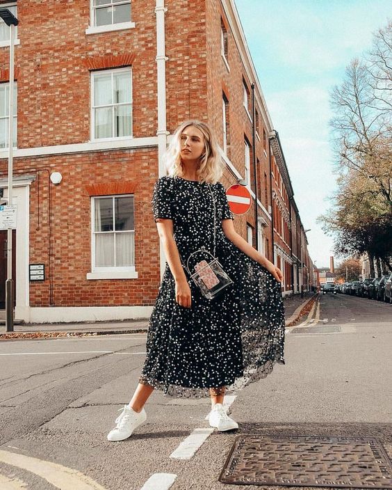 A black and white polka dot long dress paired with white sneakers creates a look that is both timeless and current. It’s perfect for a casual city walk or making a stylish statement at a rooftop party.